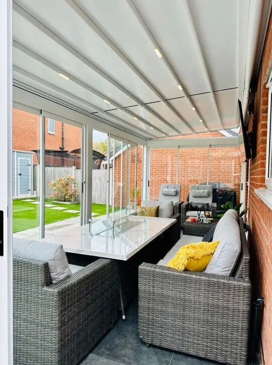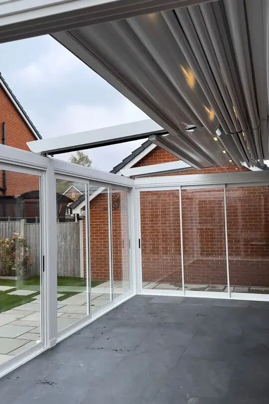 At the heart of this pergola is a fully motorized retractable roof system that can be opened or closed at the push of a button. This allows users to enjoy open skies and natural sunlight on clear days while providing immediate shelter from rain or harsh sun when needed. The system is designed to handle the unpredictable UK climate with ease, ensuring comfort and usability throughout the year.